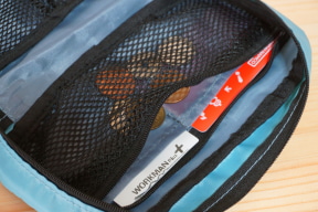 外側には常備薬や小銭を入れるのに最適なファスナー付きのポケットと、iPhone 16 Proもすっぽり収まるメッシュポケットを搭載。内側には、2つのメッシュポケットと、小銭を入れても安心なファスナー付きメッシュポケットも。さらにファスナー付きポケットのなかには、カードやレシートを収納できる2つのポケットを備える。