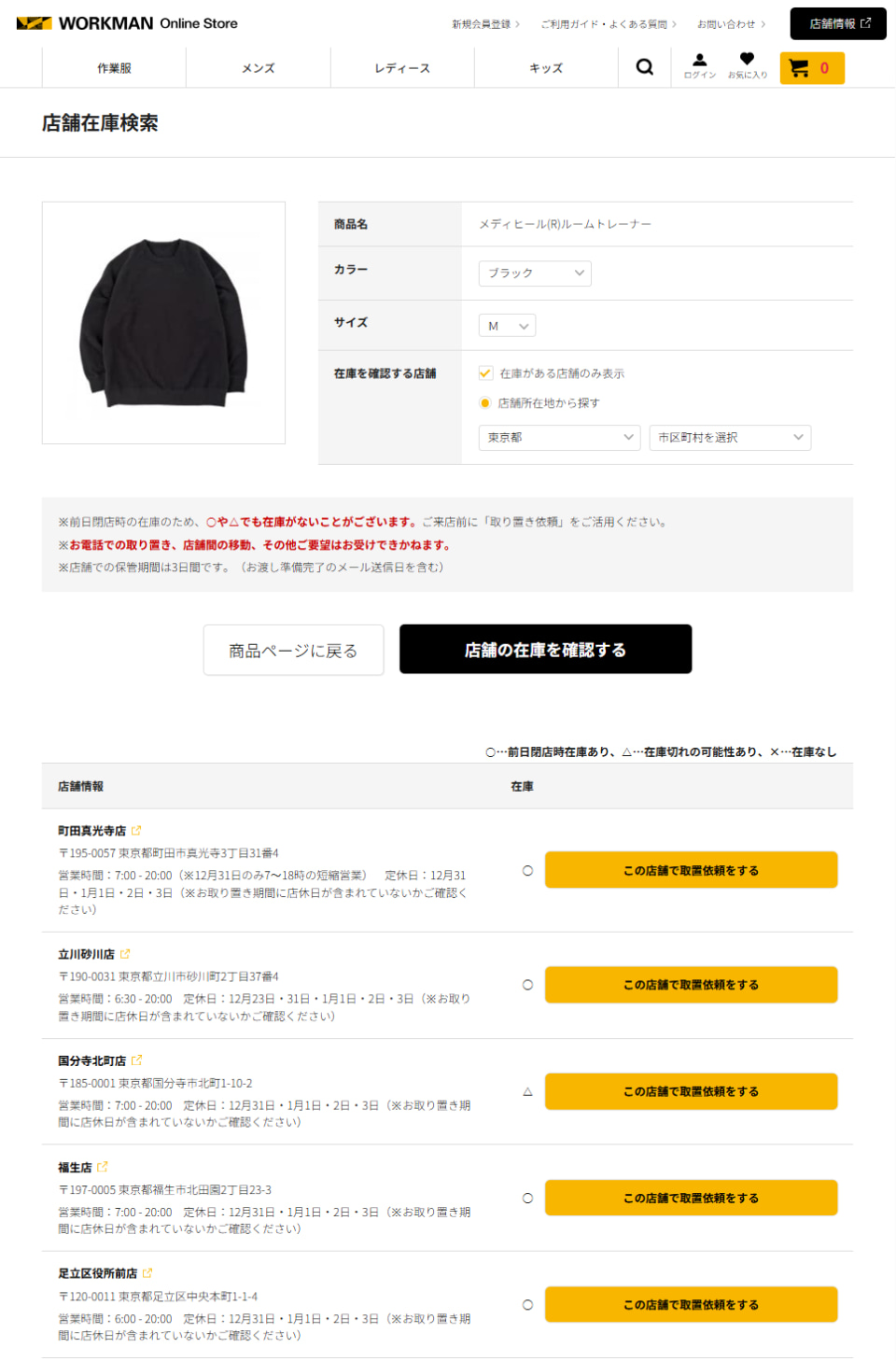 試しに6日早朝、公式サイトで「メディヒール ルームトレーナー」ブラック・Mサイズを在庫検索したところ、なんと都内でも「○…前日閉店時在庫あり」となっている店舗が20店舗以上もある。さっそく電車とバスを乗り継ぎ店に向かった。