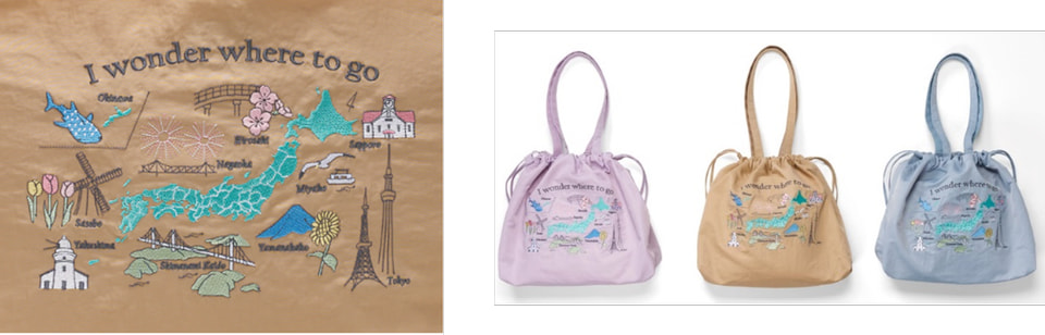 特徴: ドローストリングバッグは、日本列島のイラストマップに10エリアの観光スポットの魅力を繊細な刺繍で表現。眺めていると思わず旅に出たくなるデザインに仕上げた。色はラベンダー、ベージュ、ブルーの3色展開。ドローストリングバッグを含む総額約1万円相当の地図柄アイテムが入っている。ベージュのみ店舗限定発売。
