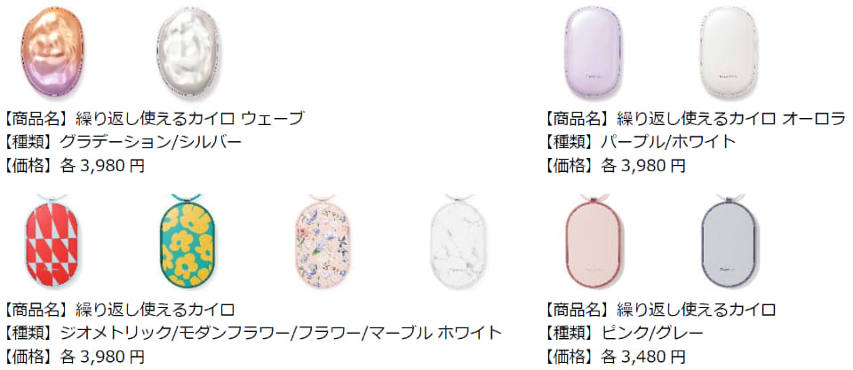 充電式で、スイッチオンから約10秒で温まる「繰り返し使えるカイロ」には、オーロラカラーやウェーブデザインなど新作を追加したほか、機能もアップグレードし、稼働時間が従来モデルから1.5時間伸長して最大約5時間に。充電時間は約1時間の短縮で、約3.5時間(ウェーブ/オーロラは3.8時間)で完了するようになった。
