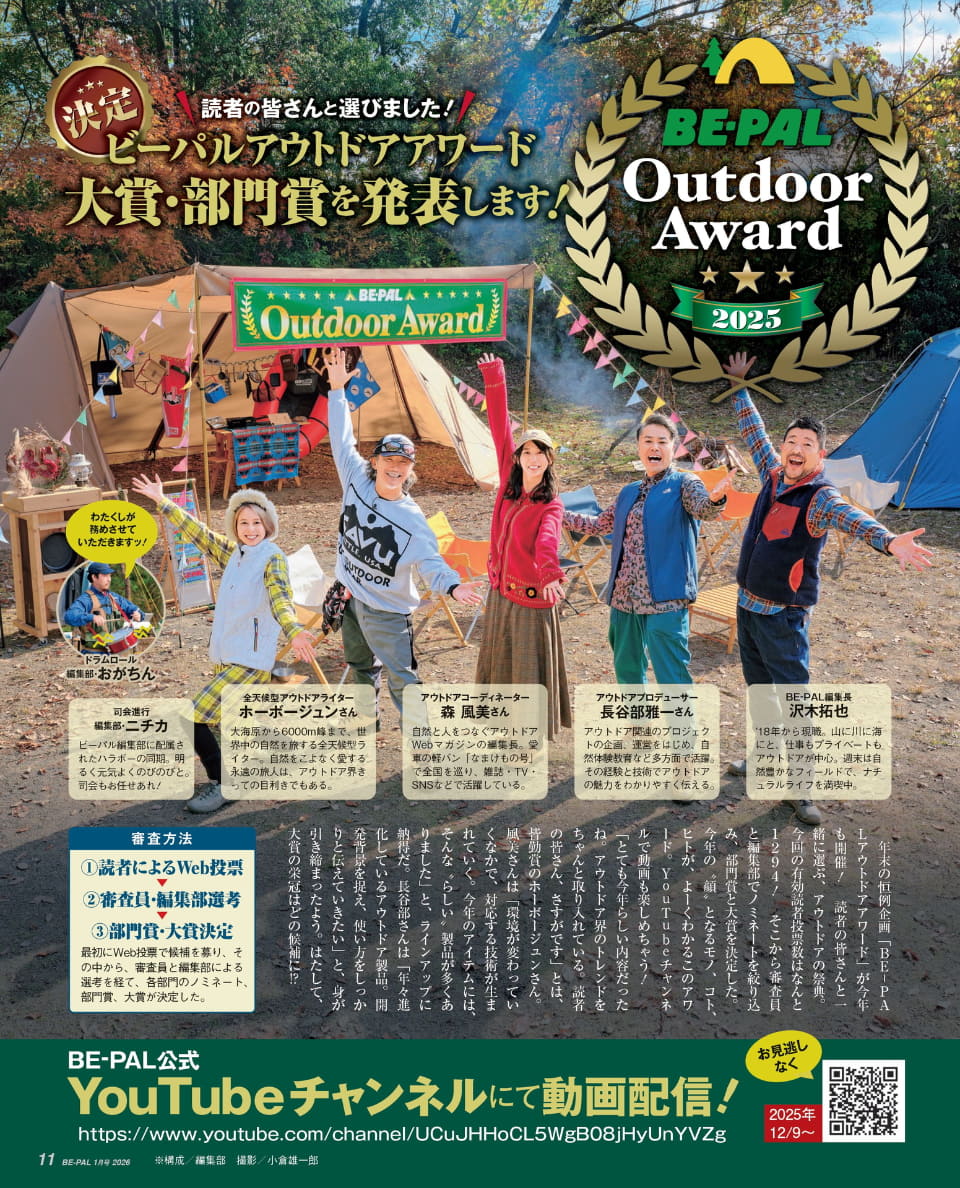 小学館は12月9日、「モンベル アウトドア “タフ” ケース」が付録のBE-PAL 2026年1月号を発売した。価格は1500円。