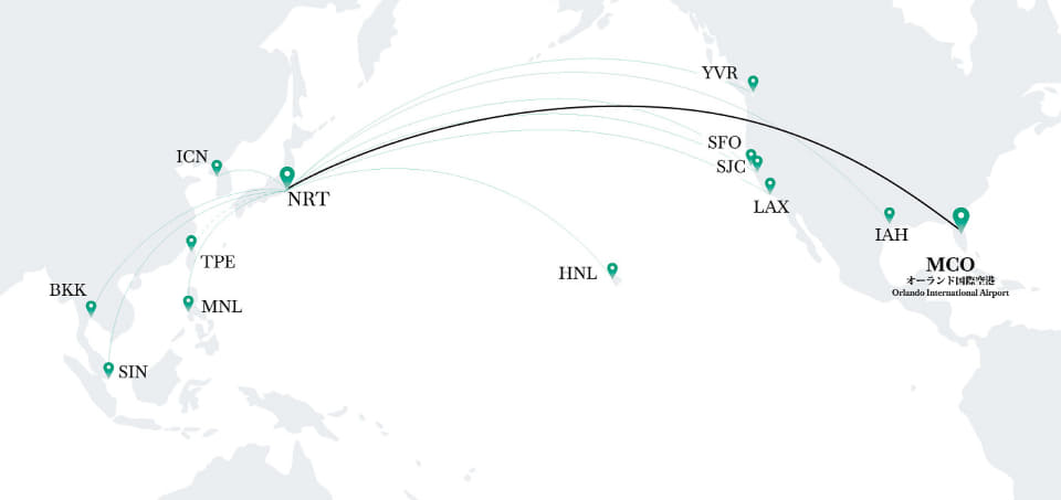 フロリダ州オーランドへの直行便は日本初で、通常乗り換えなども含め約18時間かかるところを約13時間で行くことができる。ウォルト・ディズニー・ワールド目的の利用者などをターゲットにしており、搭乗者には同パークのグッズを成田空港出発日にプレゼントする。