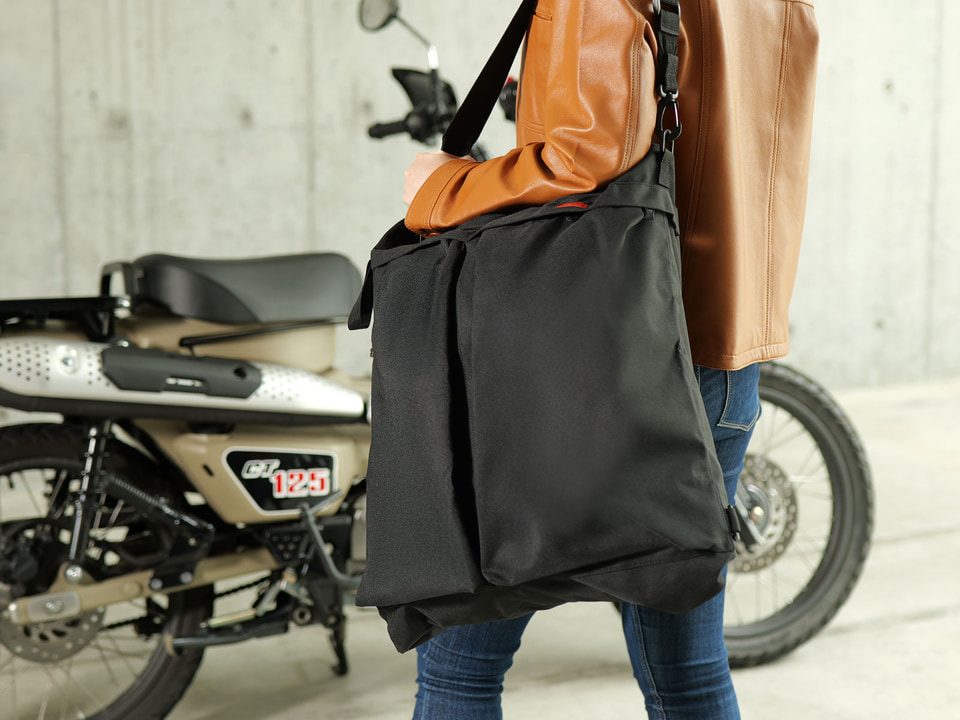 オートバイ用ヘルメットに合わせた大きな開口部が特徴で、バイザー付きのオフロードヘルメットでも収納できる。またボタンを留めるだけの簡単構造でエコバッグのように折りたたむことができ、持ち運びにも向いている。