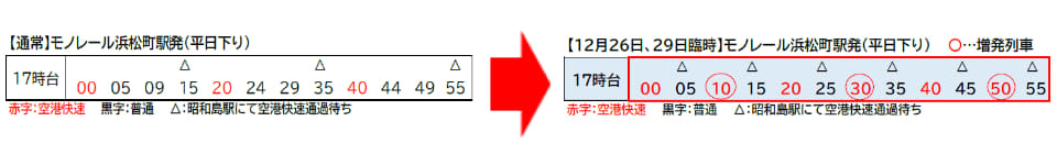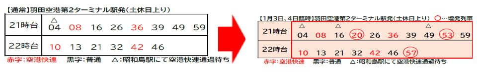また1月1日には、初日の出フライトに向けて3時台・4時台に臨時空港快速下り2本・上り1本を設定している。