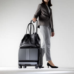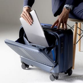 前面が一定角度まで開く「ANAオリジナル フロントオープンキャリー」シリーズから、短期旅行・出張向けとして登場。横長で重心が低く、動かしやすいのがポイントで、キャスターにはワンタッチで操作可能なストッパーを備える。