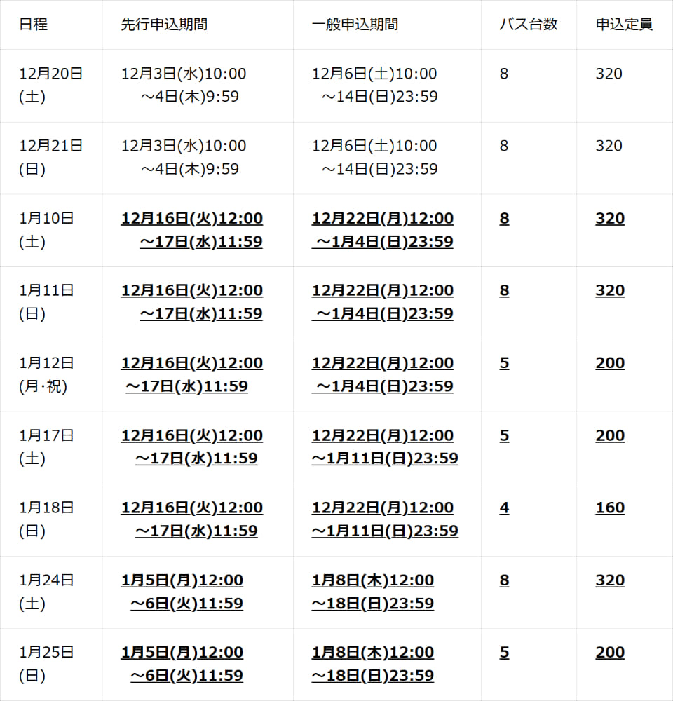 運行日: 2026年1月10日、11日、12日、17日、18日、24日、25日