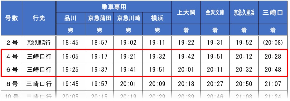 平日夕方~夜の座席指定列車「イブニング・ウィング号」では、品川駅19時台発の2本を京急久里浜行きから三崎口行きに延長。初便の2号以外はすべて三崎口行きでの運転となる。