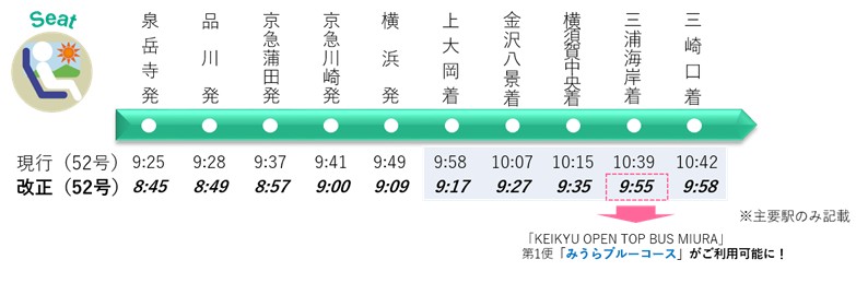 土休日に快特で設定している「ウィング・シート」は52号の発車時刻を40分繰り上げ、泉岳寺駅8時45分発とする。同便は三浦海岸駅で予約制観光バス「KEIKYU OPEN TOP BUS MIURA」みうらブルーコースへの乗り換えも可能となる(バスの発車時刻も10時15分に繰り下げる)。
