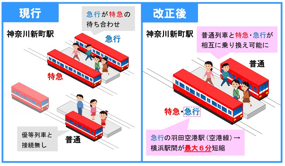 このほか空港線~横浜方面の急行では、土休日の7時台~8時台に横浜駅までの所要時間を最大6分短縮する。特急を待ち合わせる駅を横浜駅より先の上大岡駅または金沢文庫駅に変更するためで、これにより神奈川新町駅で普通と急行・特急の乗り換えも可能となる。