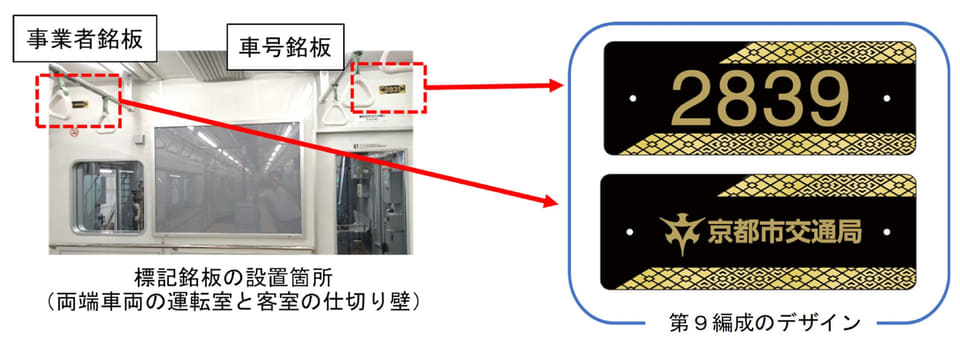 第9編成では、京都の風物詩を四季とともに表現した釘隠しを設置。「蹴上インクラインの桜」「鴨川の納涼床」「東福寺の紅葉狩り」「三十三間堂の通し矢」を描いている。