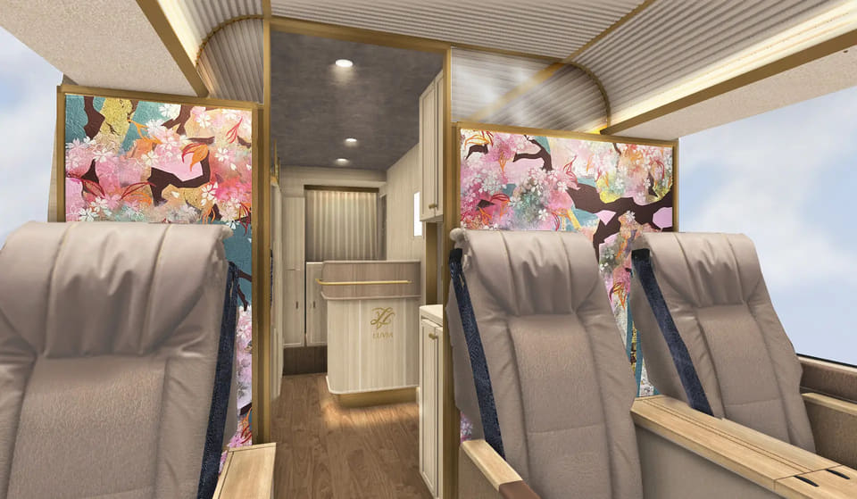 客席は2-1配列の18席のみで、車内にはトイレのほか洗面室やサービスコーナー、プライベート収納ボックスを設置。名古屋市出身の岩﨑知子氏による季節に合わせた絵画も展示する。ツアーには専属アテンダントが同行し、車内ではドリンクやおしぼりなどのサービスが受けられる。