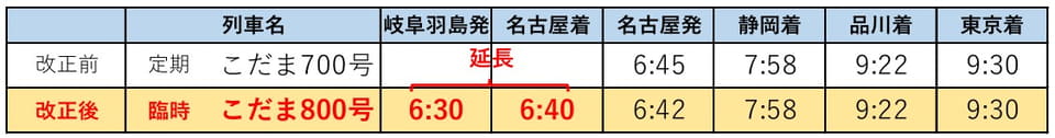 始発時間帯には上り列車を増強する。京都駅からは同駅始発の臨時「のぞみ548号」を新設し、東京駅に現行から11分早く着けるように。名古屋駅からの「のぞみ」初列車となる臨時「のぞみ498号」は、改正により「のぞみ288号」として定期列車化し、毎日利用可能とする。また名古屋駅「こだま」初列車の「こだま700号」は、特定日に臨時扱いで岐阜羽島駅始発に延長する。