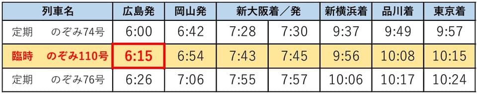 このほか博多駅からは、現行の東京行き最終列車よりも後に品川行きの臨時「のぞみ206号」を設定し、沿線での滞在可能時間を拡大。東京駅~新大阪駅・岡山駅間の「のぞみ」1往復は、特定日に広島駅発着に延長する。