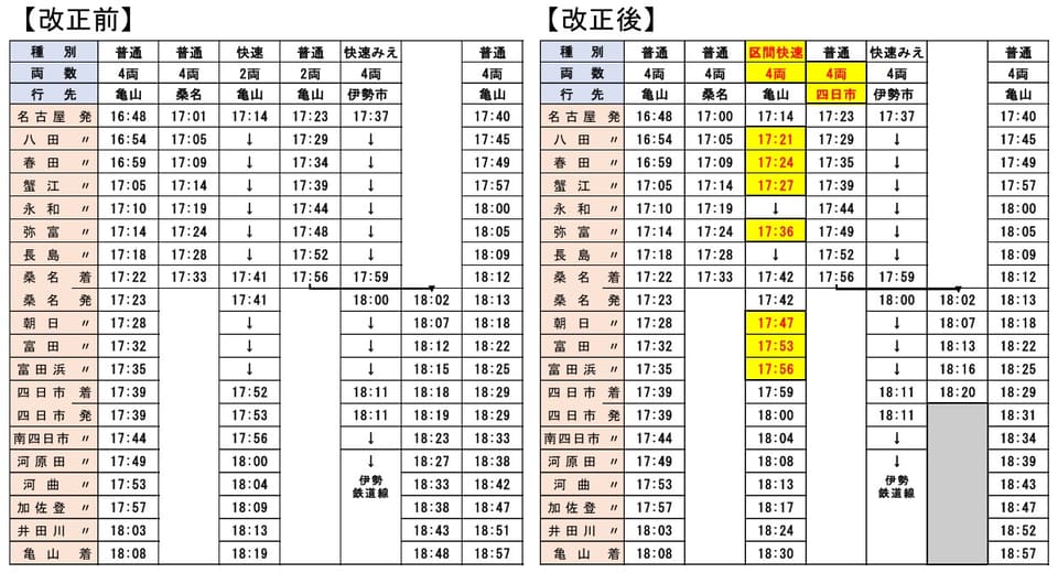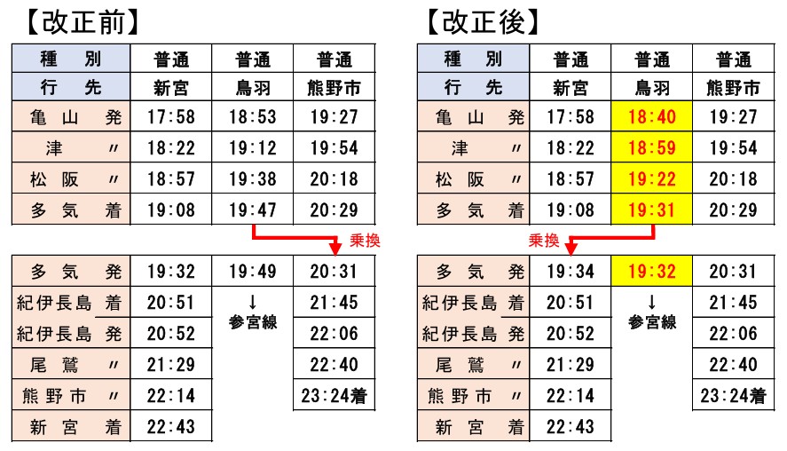また、関西線では名古屋駅17時台発の亀山行き快速を区間快速に変更し、次発の亀山行き普通を四日市行きに短縮する。この区間快速と亀山駅で連絡する鳥羽行きの発時刻を繰り上げることで、多気駅から新宮方面への乗り継ぎも可能とする。