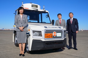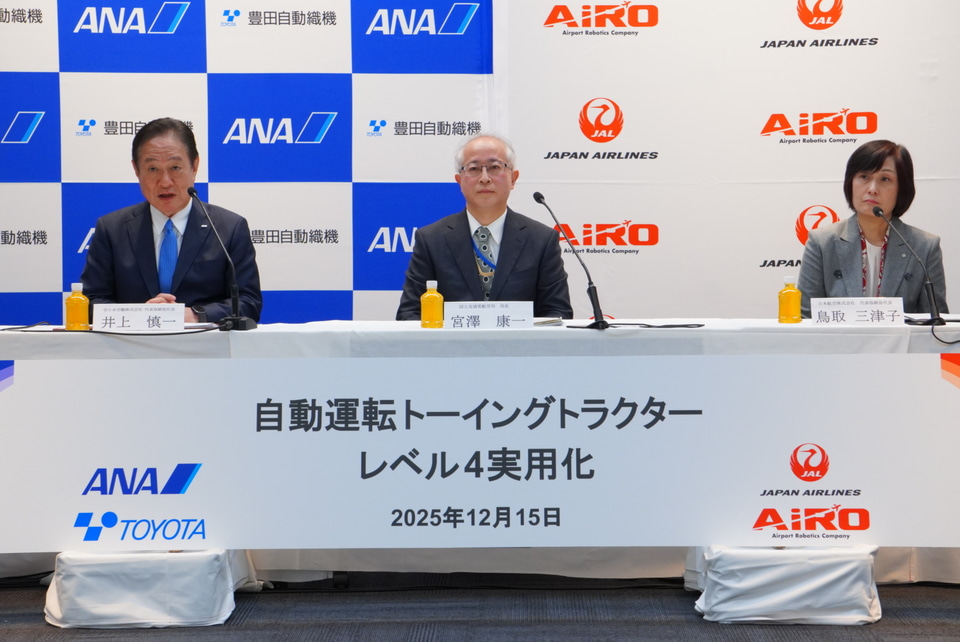 ANA、豊田自動織機、JAL、AiROは、羽田空港と成田空港において、国内初となる完全無人自動運転(レベル4相当)に対応したトーイングトラクターの実用化を12月15日に開始。羽田空港で報道公開を行なった。