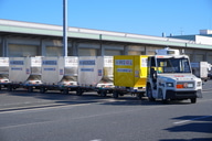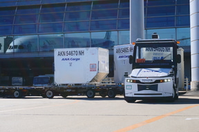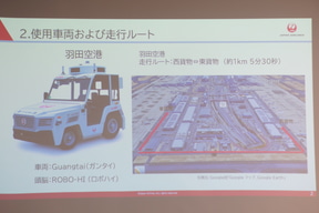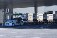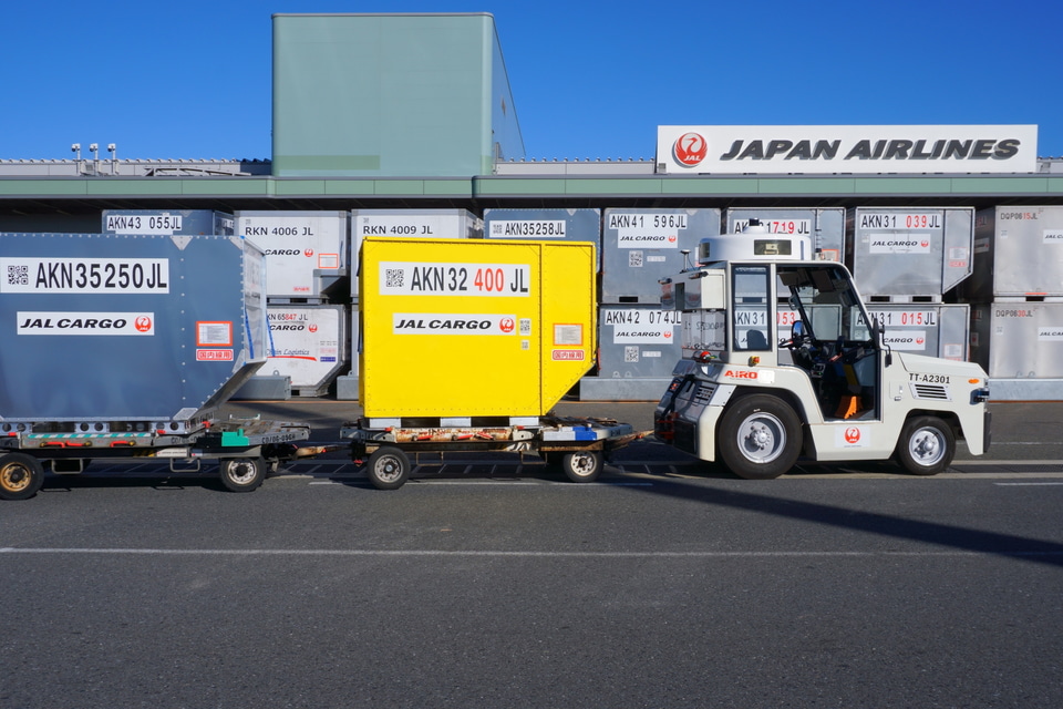 JALは、羽田空港において、AiRO(ROBO-HI)製トーイングトラクター「RoboCar Tractor 25T」1台が貨物コンテナの搬送を担当。貨物上屋間(東貨物地区~西貨物地区)約1kmを5分30秒で走行する。2026年8月ごろには2台追加予定。