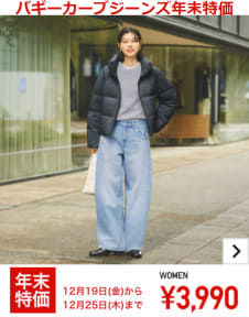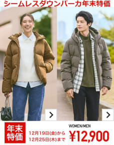 これに先立ち、セール対象品を一部先行公開。第1弾(19日~25日)では、定番の「ヒートテックインナー」が年末特価990円(通常1290円)、脚を立体的に見せるトレンドのカーブシルエットが特徴の「バギーカーブジーンズ」が年末特価3990円(通常4990円)。また、縫い目のないシルエットで寒さや雨風の侵入を防ぐ「シームレスダウンパーカ」は年末特価1万2900円(通常1万4900円)で、2000円の大幅値引きとなる。