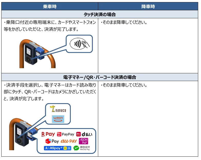 均一運賃路線の場合は乗車時に端末から決済し、そのまま降車するかたち。それ以外の路線では、タッチ決済の場合は乗降時に端末にタッチする。電子マネー・コード決済の場合は乗車時に取った整理券を降車時に提示したうえで、決済方法を申告して端末から支払う。