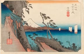 「碧く煌めく琵琶湖の旅」1日目は、横浜駅から菊川駅まで「THE ROYAL EXPRESS」に乗車。車内で歌川広重の「東海道五拾三次之内」保永堂版(復刻版画)を展示する。