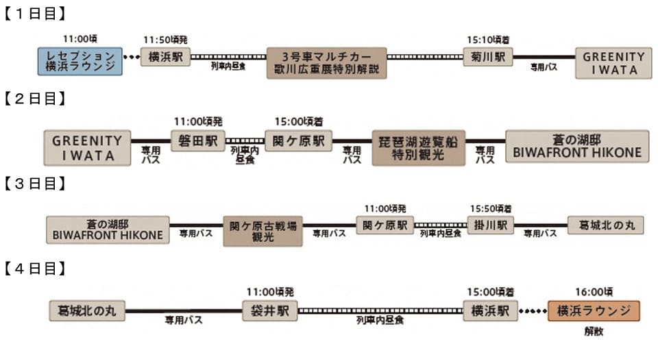 2日目には磐田駅から関ケ原駅まで列車で移動し、車内で「うな正」によるうなぎ料理を提供。到着後は琵琶湖に向かい、遊覧船を貸し切った特別なクルーズを用意する。