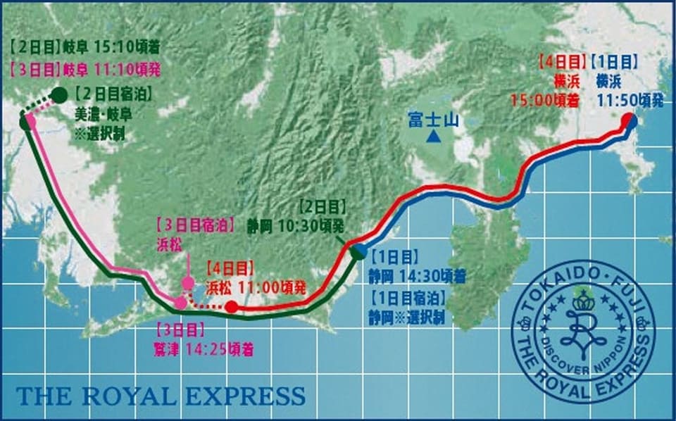 横浜駅発着で、東海道線沿線を巡る3泊4日。新たに関ケ原・琵琶湖を巡るプランを設定し、「碧く煌めく琵琶湖の旅」と命名した。11月~12月に運行した岐阜を巡るプランも「美濃・岐阜の旅」の名称で引き続き設定する。出発日は「碧く煌めく琵琶湖の旅」が4月10日・17日・24日・5月29日、「美濃・岐阜の旅」が4月3日・5月8日。代金は2人1室利用で1人あたり89万円~。