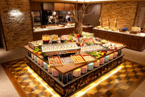 夕食バイキングでは、トリュフの赤ワインソースでいただく特製ローストビーフ ドフィノワ添えや海鮮鉄板焼きをライブキッチンから提供。また、卓上で熱々を楽しめる箱根山麓豚と白葱の緑茶蒸し、ご当地グルメの小田原おでんにサンマーメン、沼津みかんを使った温製デザートのクレープシュゼットなども味わえる。