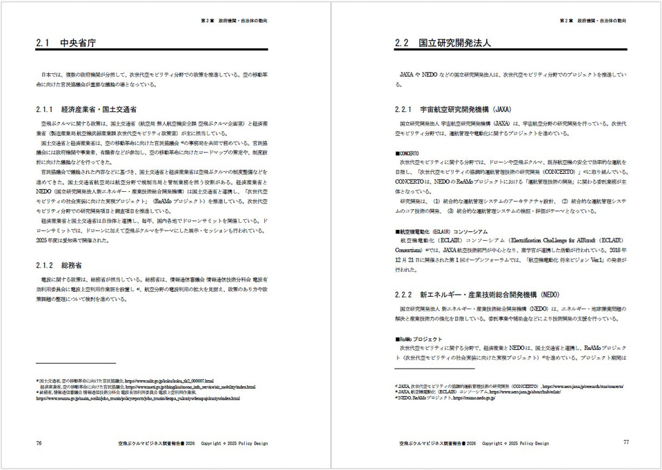 空飛ぶクルマの黎明期から産業育成やルール形成に関わってきた高橋伸太郎氏が代表を務めるポリシーデザインが執筆を行なっており、A4判168ページ。価格は「CD(PDF)版・電子版」が11万円、「CD(PDF)+冊子版」が12万1000円。