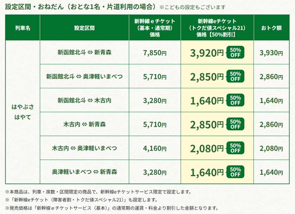 JR北海道は、北海道新幹線10周年企画として、新函館北斗~新青森間が50%オフになる「新幹線eチケット(トクだ値スペシャル21)」を設定する。えきねっと会員限定で、利用期間は2026年2月12日~3月12日、3月19日~4月19日。