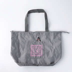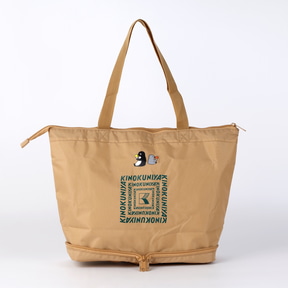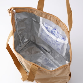 底マチ部分のファスナーを閉じることでコンパクトに折りたたみが可能で、持ち運びに便利。内側にはアルミ蒸着加工を施し、保冷剤を入れるためのメッシュポケットも備えている。
