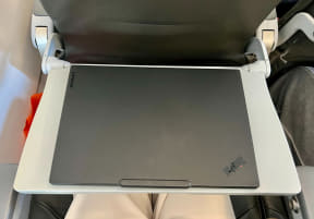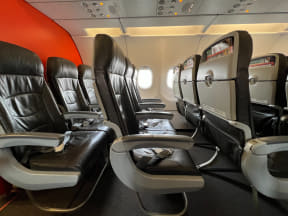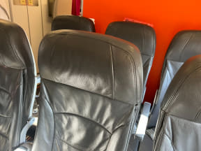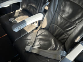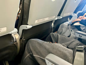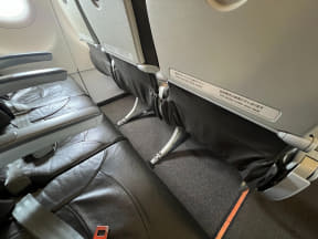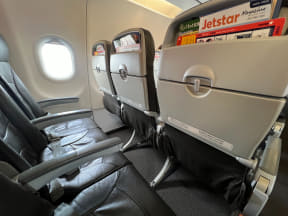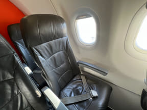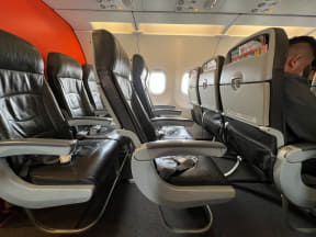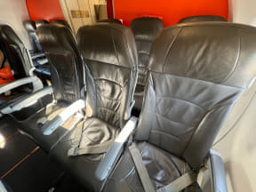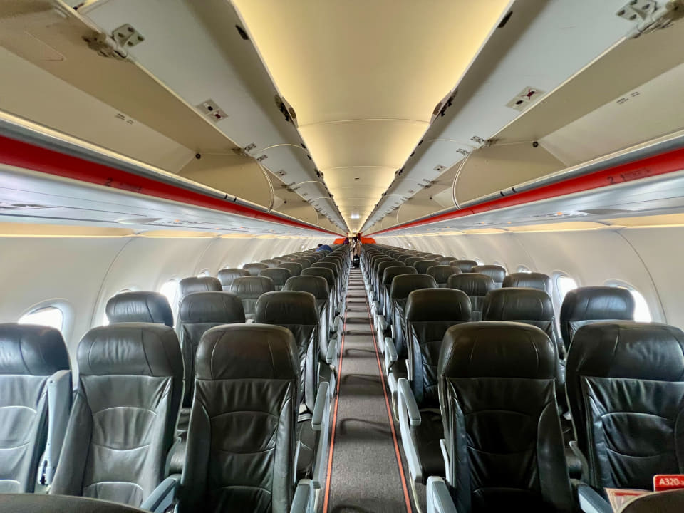さっそく初便に搭乗。座席はすべてエコノミーで、配列は3-3。座席にUSBポートや電源、個人モニター、機内Wi-Fiはない。膝まわりがやや狭いが、足元は比較的ゆとりがあり、リクライニングをフルに使えば窮屈さは軽減できる。トイレは最前方に1か所、最後方に2か所あるが、窓際に座る場合は通路への出入りが難しいので、あらかじめ済ませてから搭乗するのが無難だ。