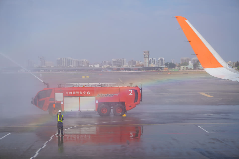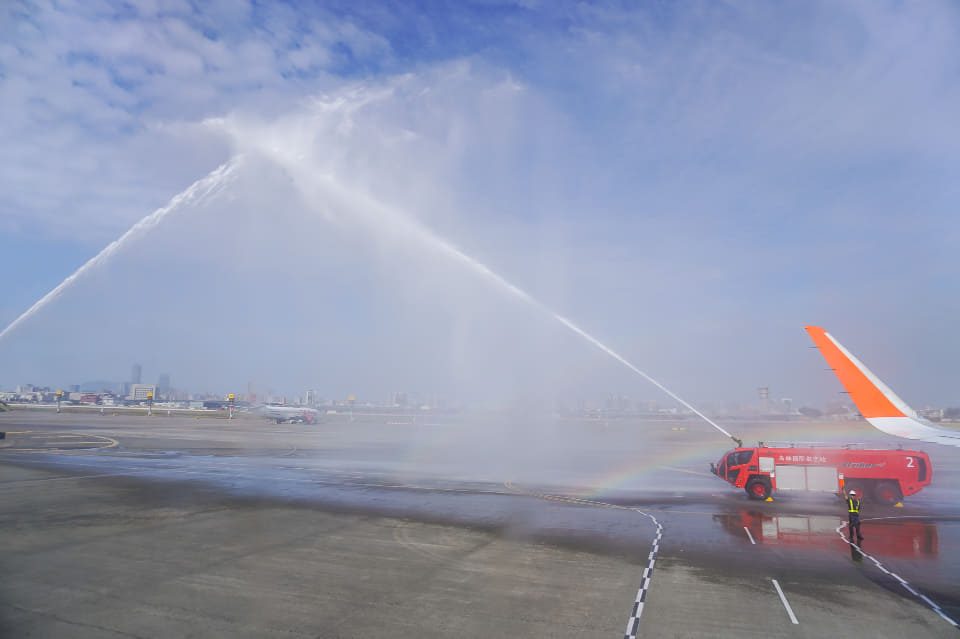 あっという間に台湾・高雄国際空港に到着。この日の天気は快晴で、現地気温は23℃。日本から来る初便に合わせて特別に“歓迎放水”が行なわれ、駐機場には虹がかかっていた。