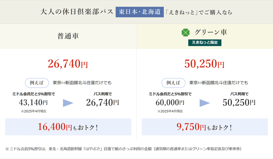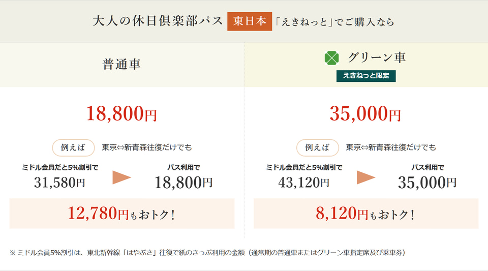 例えば、東京~新青森往復(普通車)は、ミドル会員(5%引き)3万1580円のところ、大人の休日倶楽部パス利用で1万8800円(1万2780円お得)になる。