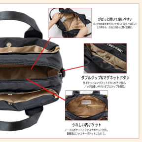また、マグネットボタンの外ポケット、内ポケットはオープンポケットと貴重品を入れるのに安心なファスナーポケットの2タイプが備わる。両面どちらを向けても使えるすっきりとした見た目も特徴で、さりげなくあしらった飛行機の刺繍もポイント。