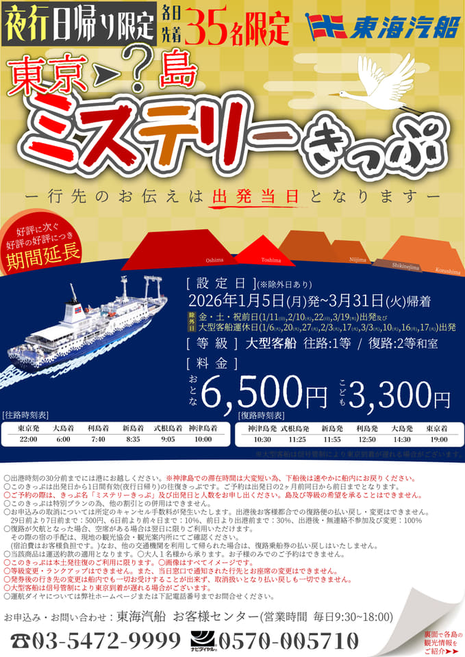 東海汽船は、往復タイプの企画きっぷ「当日行先決定!ミステリーきっぷ」を2026年1月5日~3月30日に設定する。