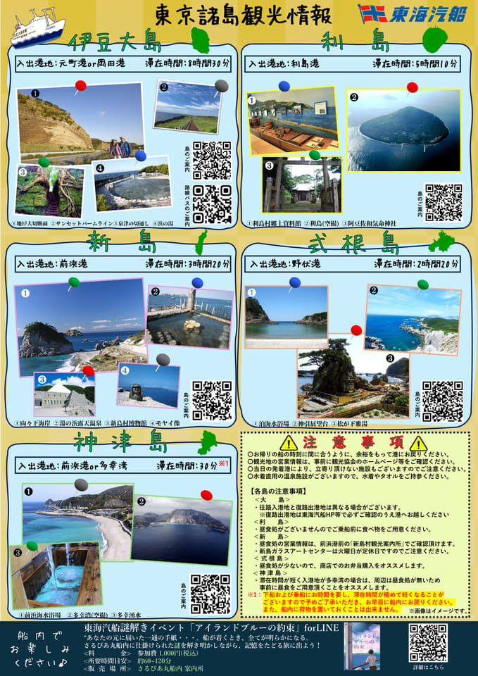 東京発着で、大島・利島・新島・式根島・神津島のいずれかまで大型客船を往復利用できるきっぷ。商品名にもあるとおり、どこまでの往復となるかは当日窓口で伝える。