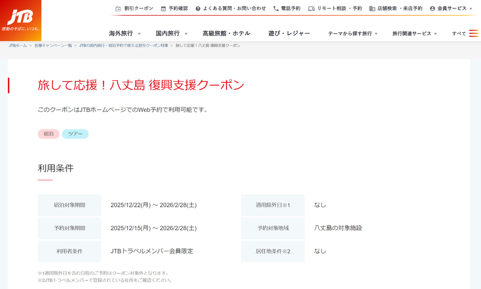 JTBは、宿泊・ツアーのWeb予約で利用できる「旅して応援!八丈島 復興支援クーポン」を12月15日から配布している。宿泊対象期間は12月22日~2026年2月28日(適用除外日なし)で、JTBトラベルメンバー会員限定。