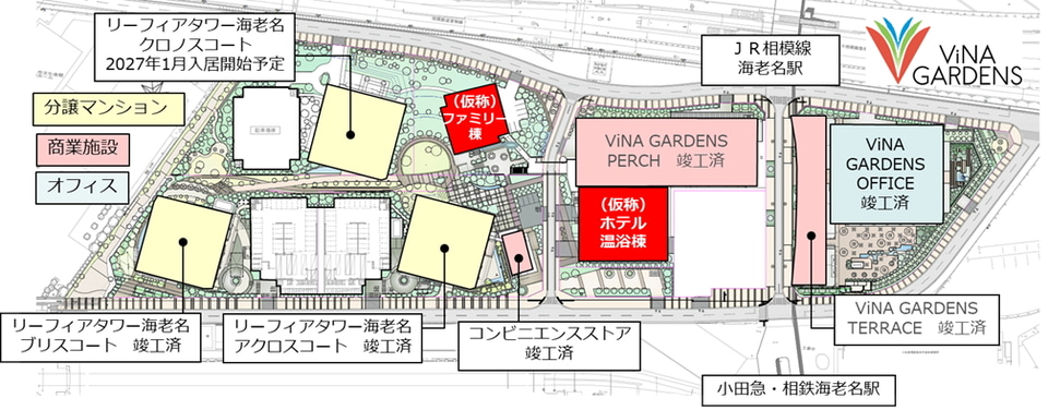 小田急電鉄は12月19日、小田急線海老名駅西口の開発エリア「ViNA GARDENS(ビナガーデンズ)」について、2027年春に開業予定の「(仮称)ファミリー棟」と、2028年開業予定の「(仮称)ホテル温浴棟」の新築工事計画を決定した。