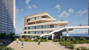 ファミリー棟(神奈川県海老名市めぐみ町512-9、地番)は、「子どももペットも、みんなが笑顔になれる家族の新拠点」として、2025年11月着工、2026年12月竣工予定。地上5階建て(高さ22.6m)に、保育園や学童保育、飲食空間、ペット向けのトリミング、しつけ教室、動物病院、ペットホテルなどを展開する。