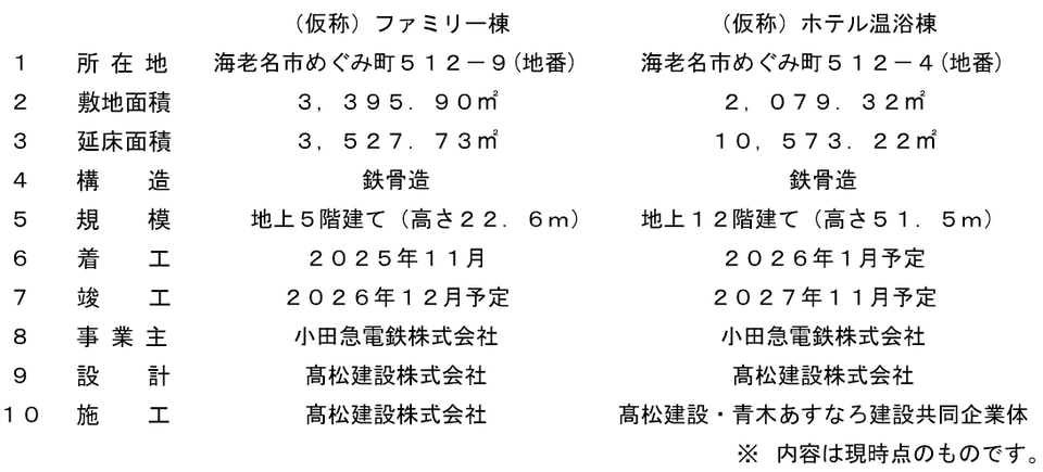 ホテル温浴棟(神奈川県海老名市めぐみ町512-4、地番)は、地上12階建て(高さ51.5m)で、2026年1月着工、2027年11月竣工予定。駅至近の立地に、地下約1300mから湧き出る天然温泉を楽しめる日帰り温浴施設やホテル、店舗を整備する。