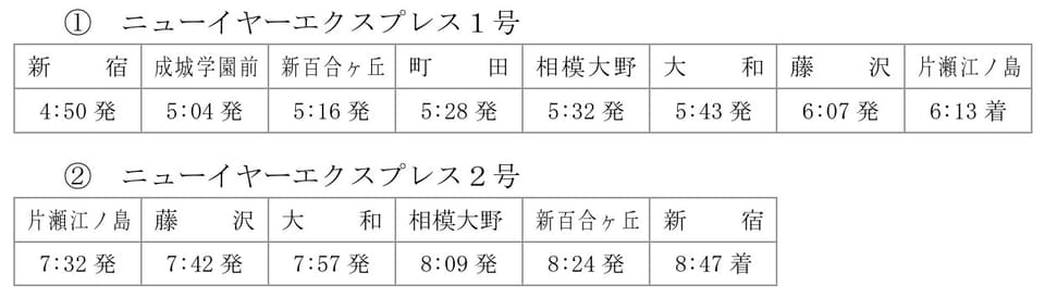 このほか、新宿駅~片瀬江ノ島駅間では特急ロマンスカーの「ニューイヤーエクスプレス」も1往復運行する。下りは新宿駅4時50分発・片瀬江ノ島駅6時13分着、上りは片瀬江ノ島駅7時32分発・新宿駅8時47分着。いずれも「EXE」10両編成を使用する。
