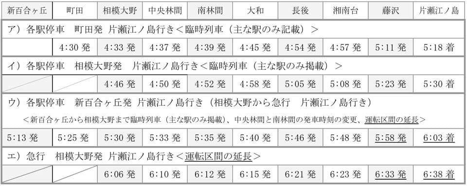 下り(片瀬江ノ島方面)では、町田駅・相模大野駅を4時台に発車する片瀬江ノ島行きの臨時各駅停車を各1本運転する。相模大野駅5時30分・6時6分発の藤沢行き急行は片瀬江ノ島行きに延長するほか、5時30分発の便は新百合ヶ丘始発とする(相模大野までは各駅停車)。