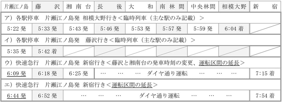 上り(相模大野方面)では、片瀬江ノ島駅を5時台に発車する相模大野行き・藤沢行きの臨時各駅停車を各1本設定。通常は藤沢始発となる6時台の快速急行2本は片瀬江ノ島始発に延長する。