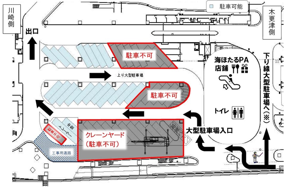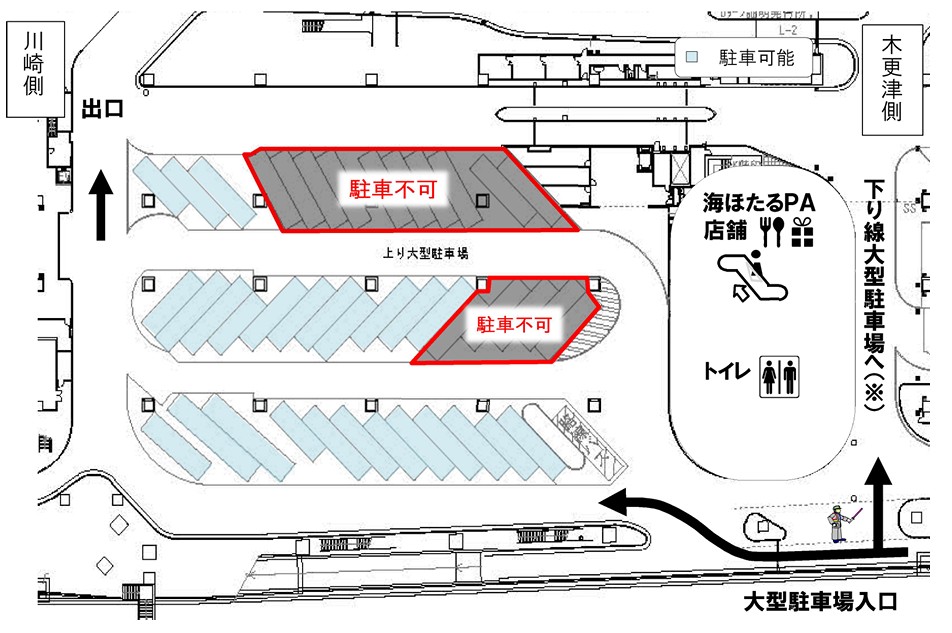 上り線の1階大型駐車場では、店舗寄りの駐車マスを駐車不可とする。1月下旬までは約20区画、2月上旬以降は約15区画が利用できなくなり、満車の際は下り線の大型駐車場に誘導する運用をとる。特に1月下旬までは駐車場内の順路も変わるため、注意が必要。