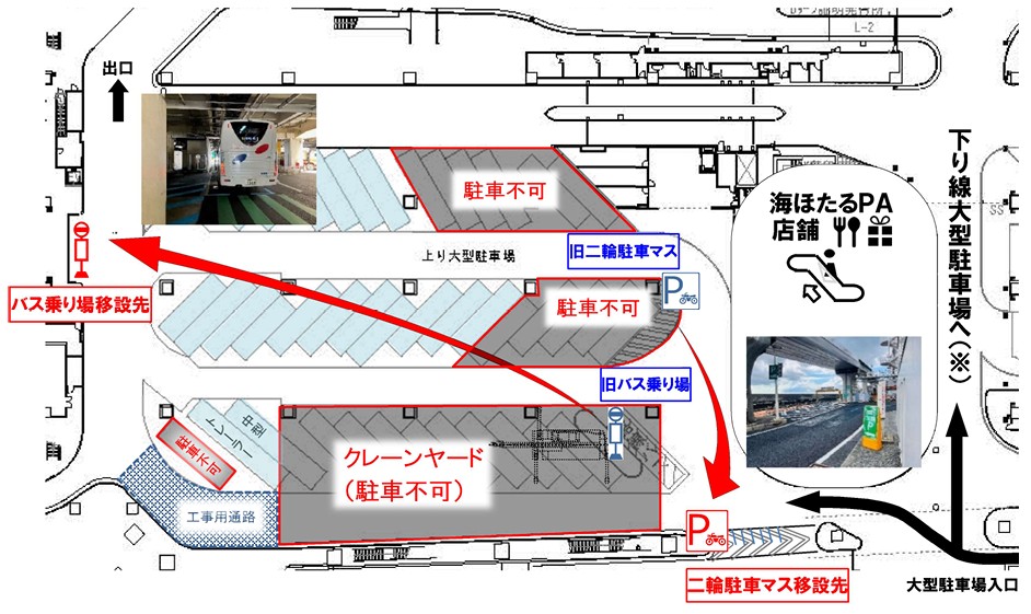 海ほたるPA、2026年1~4月は上り1階大型駐車場が一部縮小。路線バスのりば・二輪スペースも移設
