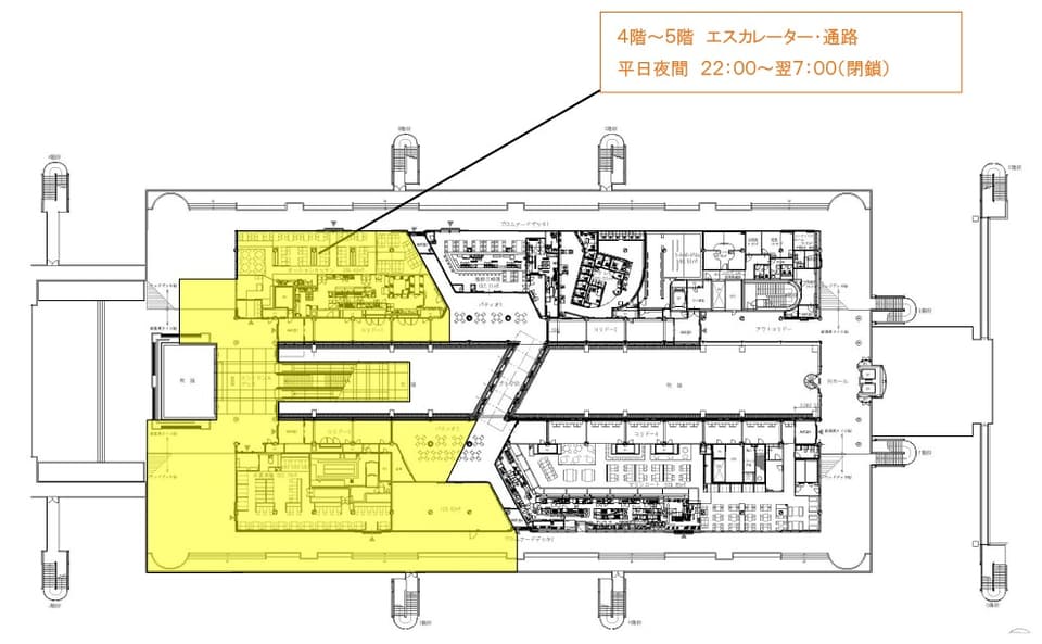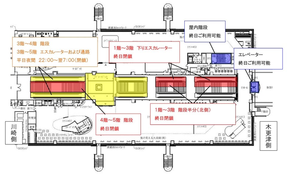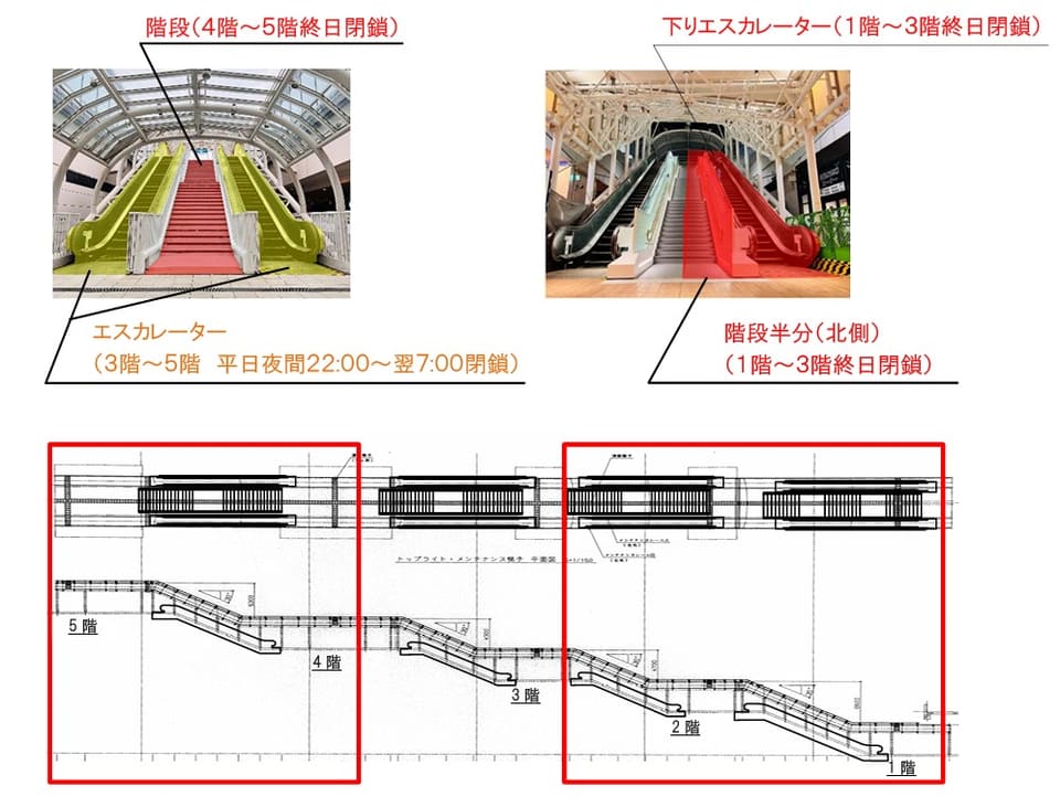 施設内では、1階~3階を結ぶ下りエスカレーターを終日閉鎖。階段も幅を半分程度として供用する。また3階~4階の階段と、3階~5階のエスカレーター・通路は平日22時~翌7時まで閉鎖する。閉鎖中はエレベーターや他の階段を利用するよう呼びかけている。