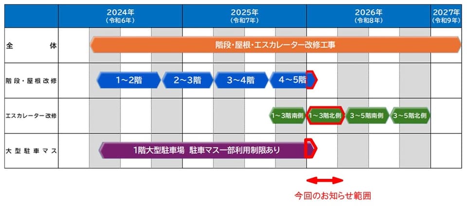 リニューアル工事は2027年春にかけて段階的に行なう計画で、時期により施工箇所を変えながら進めている。1月~4月は屋根・階段工事およびエスカレーター工事を行なう予定。