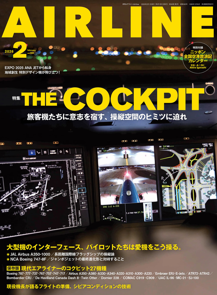 月刊エアライン 2026年2月号、特集は操縦席の世界に迫る「ザ・コクピット(THE COCKPIT)」。全国空港放浪記カレンダー付き