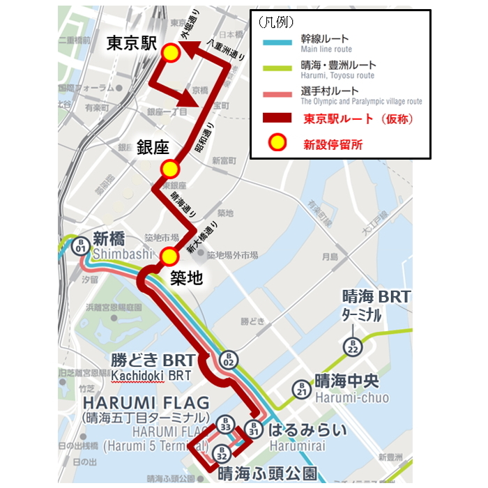 東京駅と晴海ふ頭公園・HARUMI FLAG(晴海五丁目ターミナル)などを結ぶ「東京駅ルート(仮称)」とし、新たに築地・銀座・東京駅の3か所に停留所を設置。2026年秋ごろの運行開始を予定する。なお運行開始日やダイヤなどの詳細については、決定次第の発表となる。