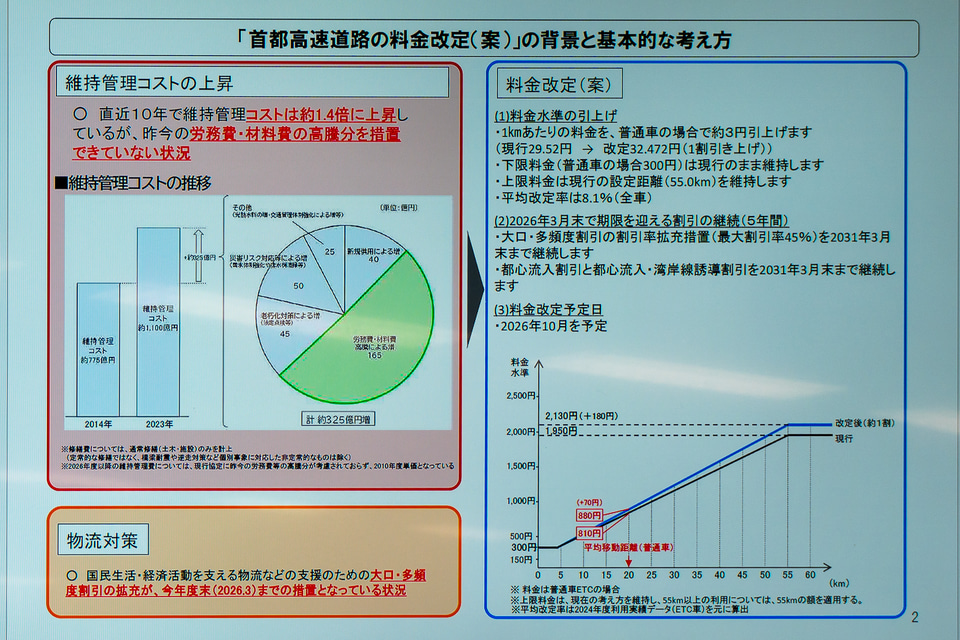 会見に登壇した首都高速道路 代表取締役社長の寺山徹氏は、値上げの要因について「近年の急激な労務費・材料費の高騰、激甚化する災害などで維持管理コストが上昇していることが喫緊の課題」と挙げており、本件についてはこれからパブリックコメントの募集も行ない(2026年1月7日17時まで)、国交大臣への認可申請へ進む予定。