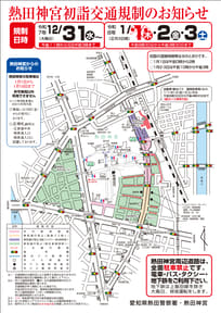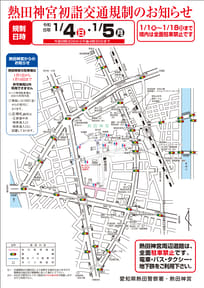 大晦日11時~元日3時と、三が日の8時30分~15時30分は、熱田駅・神宮前駅から境内に至る県道226号とその周辺で車両通行禁止を実施。また熱田神宮南門周辺は、三が日までの終日と1月4日・5日9時30分~16時30分に歩行者専用とする。